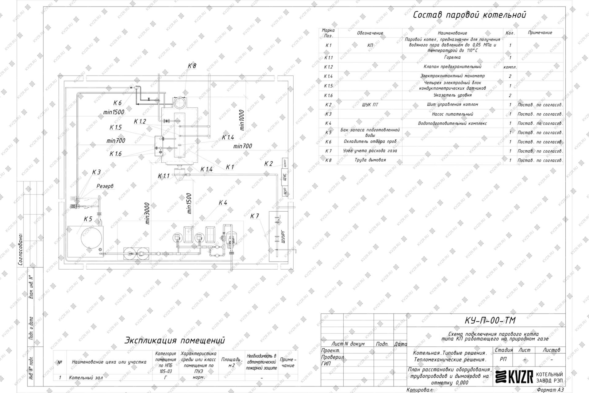 Чтобы правильно подключить газовый паровой котел 1500 кг / 1.5 т пара -115 °С -0,07 МПа / 0,7 кгс/cм² в котельной необходимо оставить проемы для обслуживания оборудования во время эксплуатации. На представленной здесь схеме обозначены их размеры. Кроме того, в данной примерной схеме монтажа паровых котлов и оборудования указан перечень минимально необходимого вспомогательного оборудования.
