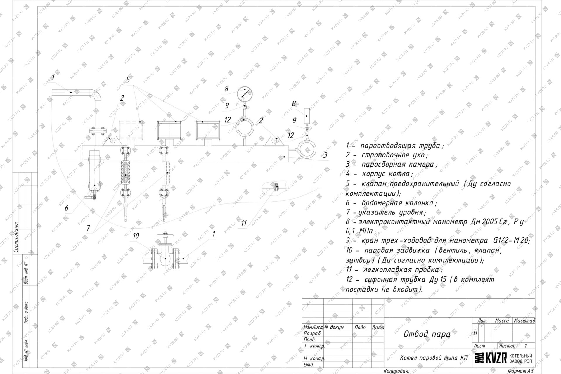 В верхней части котла приварен паросборник, представляющий собой полуцилиндр. На паросборной камере устанавливаются предохранительные клапаны и два штуцера Ду15, один для установки электроконтактного манометра, второй для спуска воздуха с котла при заполнении водой при подготовке к работе.
