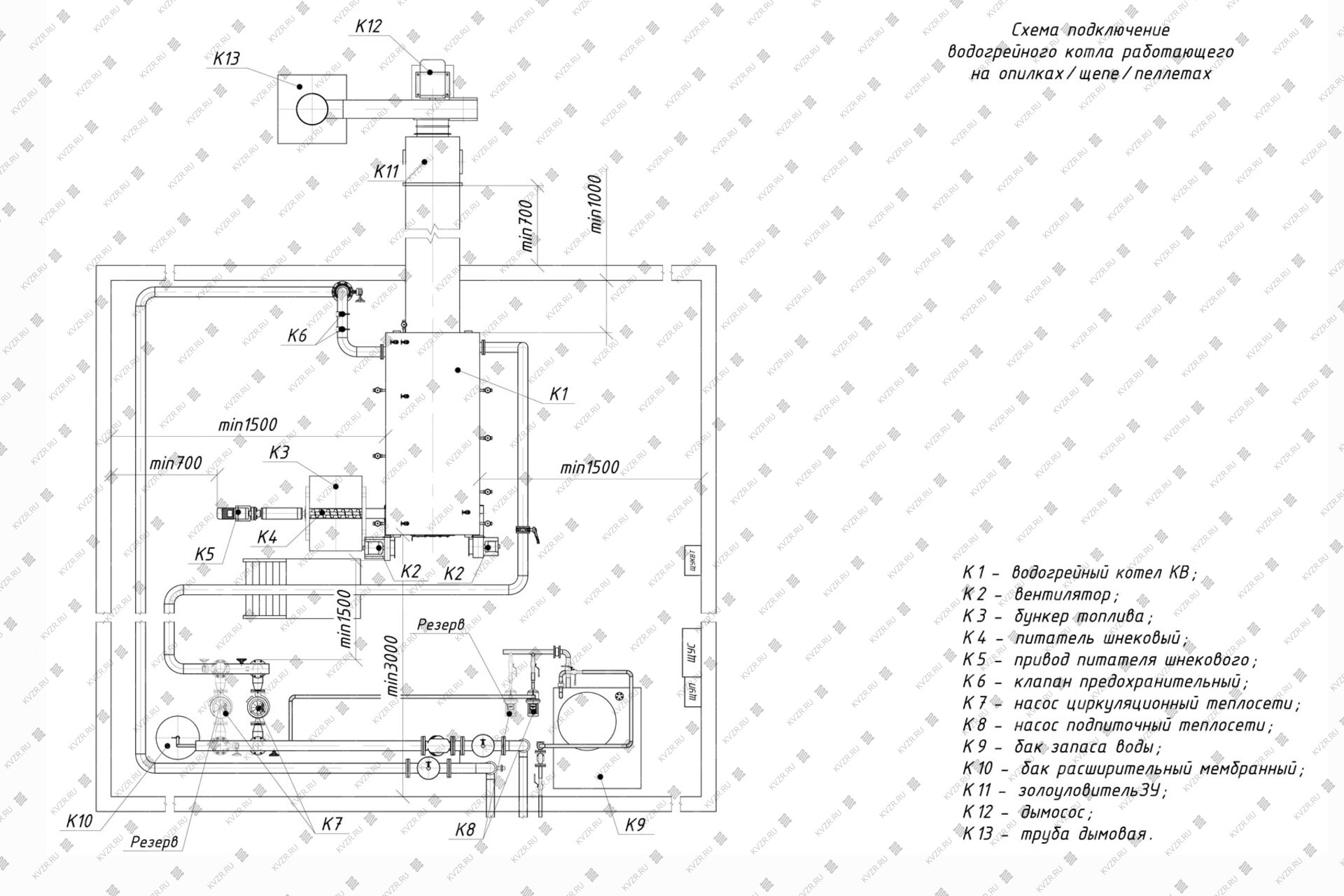 Чтобы правильно подключить пеллетный котел 500 кВт в котельной необходимо оставить проемы для обслуживания оборудования во время эксплуатации. На представленной здесь схеме указаны их минимальные размеры. Кроме того, в данной примерной схеме монтажа водогрейных котлов и оборудования указан перечень минимально необходимого вспомогательного оборудования для правильной работы котла.